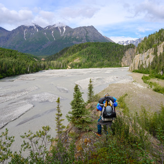 From its confluence with the Tat to the departure point, the walk up the O'Connor was one of the highlights of the route. Most of the travel is efficient gravel bar walking aided by the packraft crossings wherever the river runs into a cliff wall. We elected to keep our drysuits on and boats accessible so we could ferry back and forth as needed. Before the advent of internal storage, rigging your boat with your backpack on the bow with the shoulder straps facing up (portage mode), was a seamless way to transition between paddling and hiking and served us well during this portion of the route. Eventually, the river constricts through a short canyon and you'll have to ascend above river level into the forest before you can return to gravel bars. We found decent game trails on the south side.